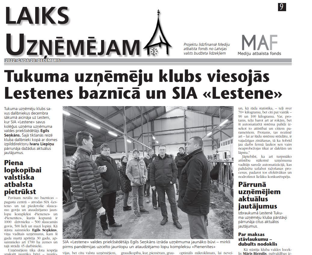 Tukuma uzņēmēju klubs savus dalībniekus decembra sākumā aicināja uz Lesteni, kur SIA «Lestene» savus kolēģus uzņēma uzņēmuma valdes priekšsēdētājs Egils Seņkāns. Šajā tikšanās reizē kluba dalībnieki kopā ar domes izpilddirektoru Ivaru Liepiņu pārrunāja dažādus aktuālus jautājumus.