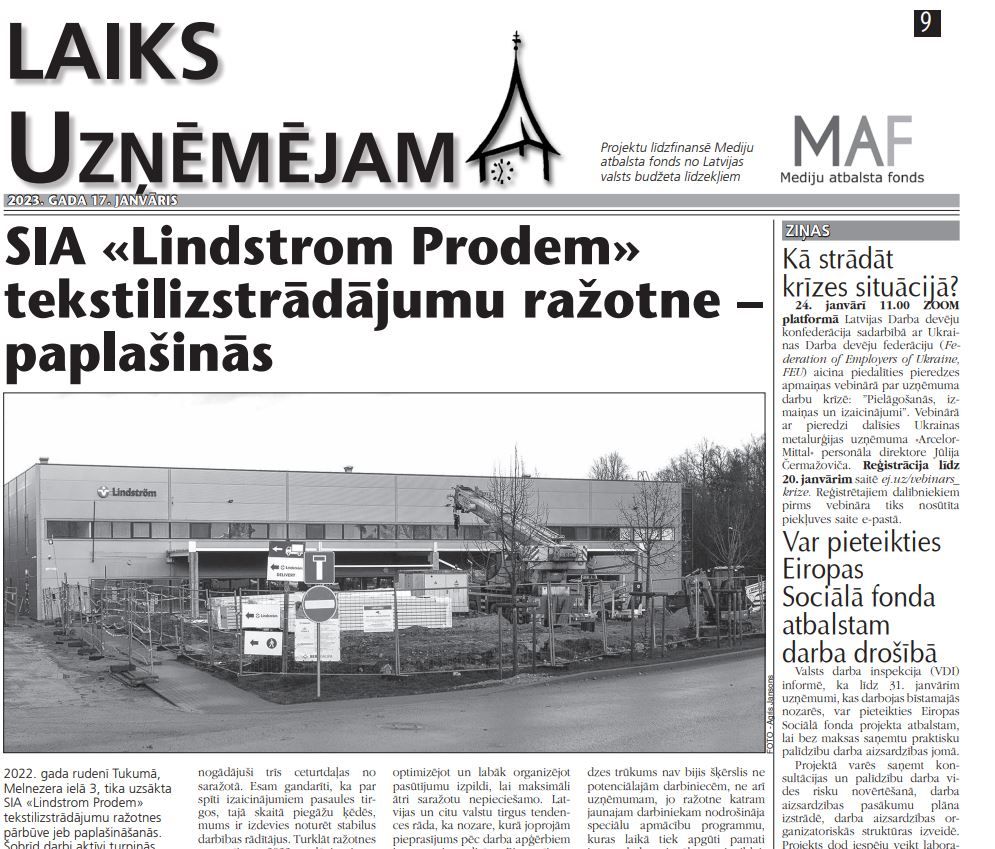 SIA «Lindstrom Prodem» tekstilizstrādājumu ražotne – paplašinās