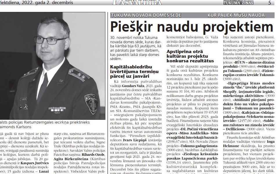 30. novembrī notika Tukuma novada domes sēde, kuras darba kārtībā bija 63 jautājumi, kā arī pārskats par tiem darbiem, kas paveikti laikā starp domes sēdēm.