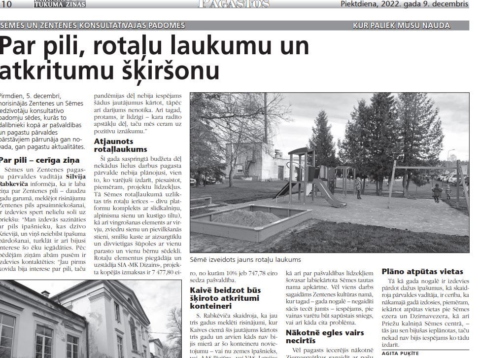 Pirmdien, 5. decembrī, norisinājās Zentenes un Sēmes iedzīvotāju konsultatīvo padomju sēdes, kurās to dalībnieki kopā ar pašvaldības un pagastu pārvaldes pārstāvjiem pārrunāja gan novada, gan pagastu aktualitātes.