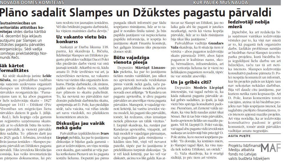 Tautsaimniecības un teritoriālās attīstības komitejas sēdes darba kārtībā 14. decembrī bija iekļauts jautājums par Slampes un Džūkstes pagastu pārvaldes reorganizāciju. Sēdi vadīja komitejas priekšsēdētājs Normunds Rečs.