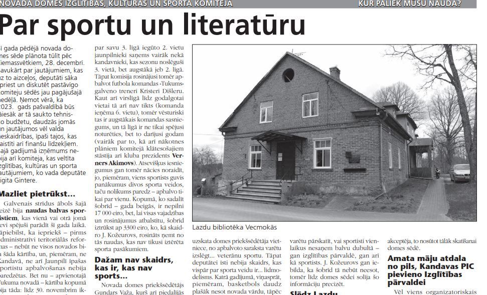 Šī gada pēdējā novada domes sēde plānota tūlīt pēc Ziemassvētkiem, 28. decembrī. Savukārt par jautājumiem, kas uz to aizceļos, deputāti sāka spriest un diskutēt pastāvīgo komiteju sēdēs jau pagājušajā nedēļā. Ņemot vērā, ka 2023. gadu pašvaldībā būs jāiesāk ar tā saukto tehnisko budžetu, daudzās jomās un jautājumos vēl valda neskaidrības, īpaši tajos, kas saistīti arī finanšu līdzekļiem. Šajā gadījumā izņēmums nebija arī komiteja, kas veltīta Izglītības, kultūras un sporta jautājumiem, ko vada deputāte Ligita Gintere.