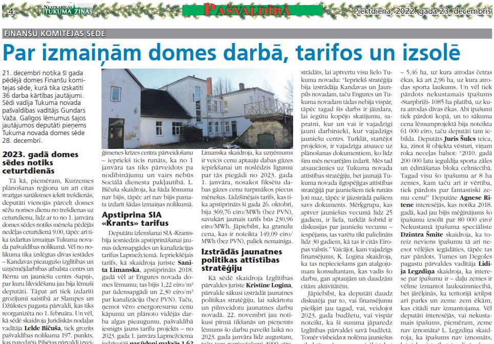 21. decembrī notika šī gada pēdējā domes Finanšu komitejas sēde, kurā tika izskatīti 36 darba kārtības jautājumi. Sēdi vadīja Tukuma novada pašvaldības vadītājs Gundars Važa. Galīgos lēmumus šajos jautājumos deputāti pieņems Tukuma novada domes sēde 28. decembrī. 2023. gadā domes sēdes notiks ceturtdienās