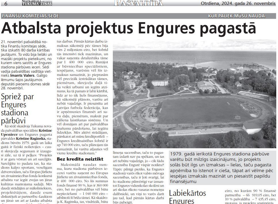 21. novembrī pašvaldībā notika Finanšu komitejas sēde, tika izskatīti 80 darba kārtības jautājumi. To vidū bija lielāki un mazāki projektu pieteikumi, no kuriem viens saistīts ar Engures stadiona pārbūves ieceri. Sēdi vadīja pašvaldības vadītāja vietnieks Imants Valers. Galīgo lēmumu šajos jautājumos deputāti pieņems domes sēdē 28. novembrī.