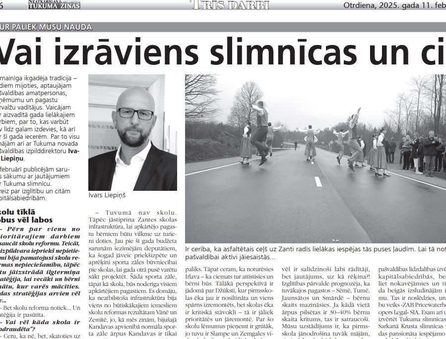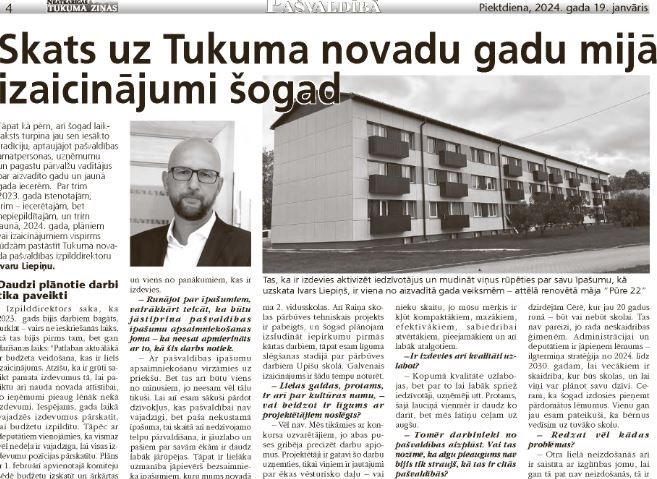 Tāpat kā pērn, arī šogad laikraksts turpina jau sen iesākto tradīciju, aptaujājot pašvaldības amatpersonas, uzņēmumu un pagastu pārvalžu vadītājus par aizvadīto gadu un jaunā gada iecerēm. Par trim 2023. gadā īstenotajām, trim – iecerētajām, bet nepiepildītajām, un trim jaunā, 2024. gada plāniem vai izaicinājumiem, vispirms lūdzām pastāstīt Tukuma novada pašvaldības izpilddirektoru Ivaru Liepiņu. Daudzi...