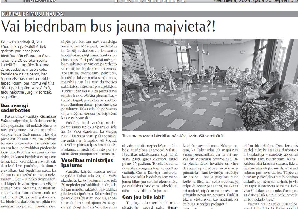Kā esam uzzinājuši, jau kādu laiku pašvaldībā tiek spriests par iespējamo biedrību pārcelšanu no ēkas Talsu ielā 20 uz ēku Spartaka ielā 2a – agrāko Tukuma 2. vidusskolas mazo skolu. Pagaidām nav zināms, kad šī pārcelšanās varētu notikt, tāpēc līgumi par nomu vēl tiks slēgti par telpām vecajā ēkā, taču nākotnē Jurģi visdrīzāk sagaidāma.