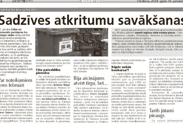 Kur paliek mūsu nauda? MAF janvāra Vides un komunālo jautājumu komitejas sēdes darba kārtībā nebija neviena jautājuma, kura izskatīšana noslēgtos ar lēmuma pieņemšanu, taču bija arī trīs informatīvi jautājumi. Tie bija saistīti ar sadzīves atkritumu un bioloģisko atkritumu savākšanu, ar šīs savākšanas izmaksām jeb tarifu un SIA «Atkritumu apsaimniekošanas sabiedrība «Piejūra»». Tālākais risinājums šajos...