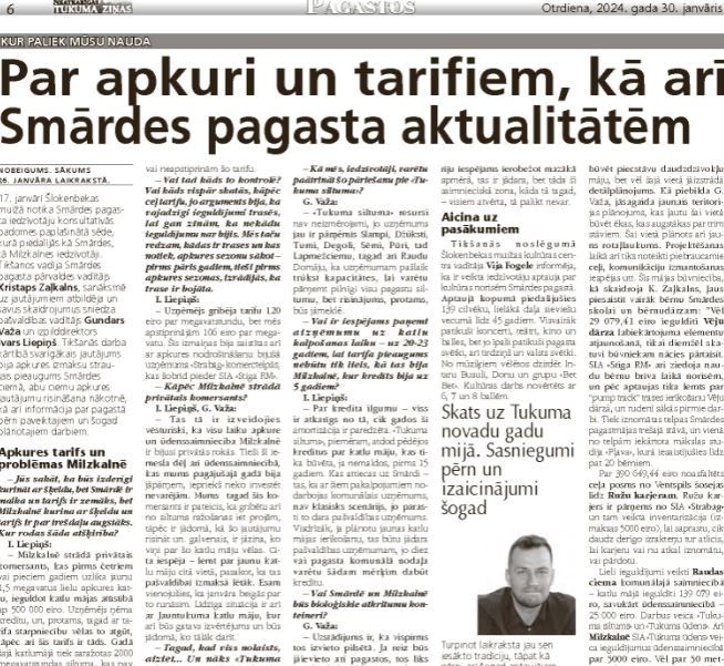 Iedzīvotāju sapulcē Pirms nedēļas Šlokenbekas muižā notika Smārdes pagasta iedzīvotāju konsultatīvās padomes paplašinātā sēde, kurā piedalījās kā Smārdes, tā Milzkalnes iedzīvotāji. Tikšanos vadīja Smārdes pagasta pārvaldes vadītājs Kristaps Zaļkalns, sanāksmē uz jautājumiem atbildēja un savus skaidrojumus sniedza pašvaldības vadītājs Gundars Važa un izpilddirektors Ivars Liepiņš. Tikšanās darba kārtībā svarīgākais jautājums bija apkures izmaksu straujais...