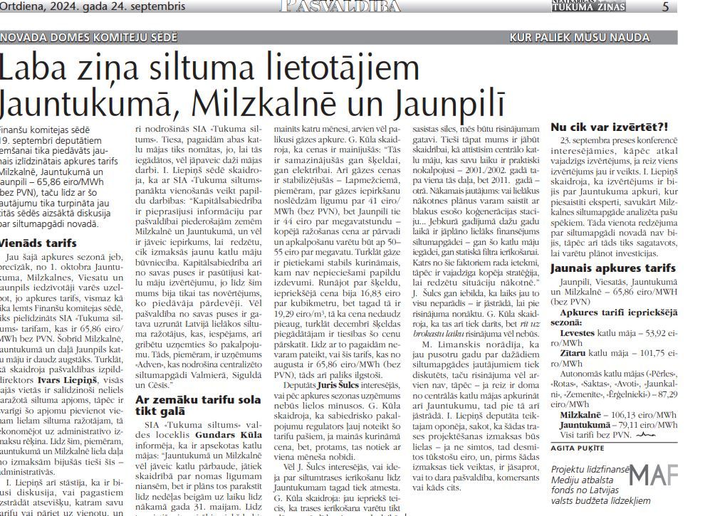 Finanšu komitejas sēdē 19. septembrī deputātiem lemšanai tika piedāvāts jaunais izlīdzinātais apkures tarifs Milzkalnē, Jauntukumā un Jaunpilī – 65,86 eiro/MWh (bez PVN), taču līdz ar šo jautājumu tika turpināta jau citās sēdēs aizsāktā diskusija par siltumapgādi novadā.