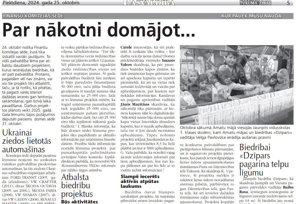 24. oktobrī notika finanšu komitejas sēde, kurā tika izskatīti jautājumi. To vidū pašvaldība lēma par atbalstu daudziem projektiem, kurus iecerējušas biedrības, kā arī pati pašvaldība. Protams, pagaidām vēl nav zināms, vai visi šie projekti tiks atbalstīti, taču, ja tā notiks, kā pilsētas, tā pagasti varēs īstenot dažādas ieceres gan teritoriju sakārtošanai, gan brīvā laika pavadīšanai. Darbus projektos plānots veikt 2025. gadā. Gala lēmumu šajos jautājumos deputāti pieņems domes sēdē 31. oktobrī.