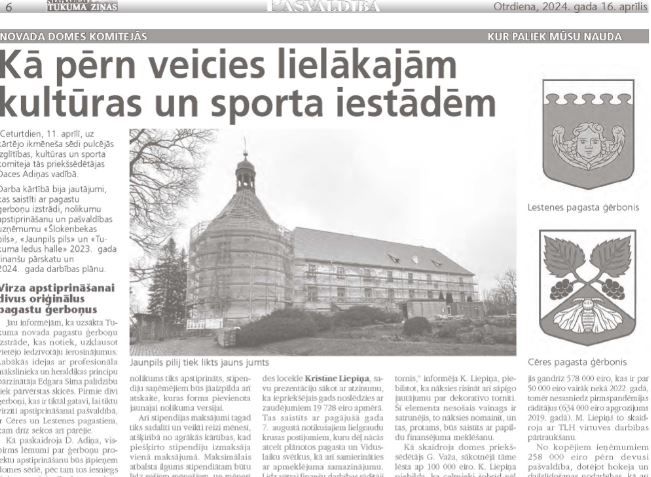 Ceturtdien, 11. aprīlī, uz kārtējo ikmēneša sēdi pulcējās Izglītības, kultūras un sporta komiteja tās priekšsēdētājas Daces Adiņas vadībā. Darba kārtībā bija jautājumi, kas saistīti ar pagastu ģerboņu izstrādi, nolikumu apstiprināšanu un pašvaldības uzņēmumu «Šlokenbekas pils», «Jaunpils pils» un «Tukuma ledus halle» 2023. gada finanšu pārskatu un 2024. gada darbības plānu.