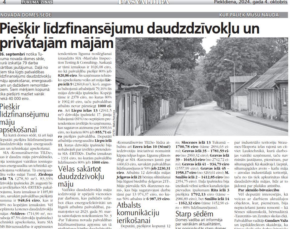 26. septembrī notika Tukuma novada domes sēde, kurā izskatīja 79 darba kārtības jautājumus. Daļā no tiem tika lūgts pašvaldības līdzfinansējums daudzdzīvokļu māju apsekošanai, energoauditam un dažādiem remontdarbiem. Šiem mērķiem kopumā tika piešķirti mazliet vairāk nekā 40 000 eiro.