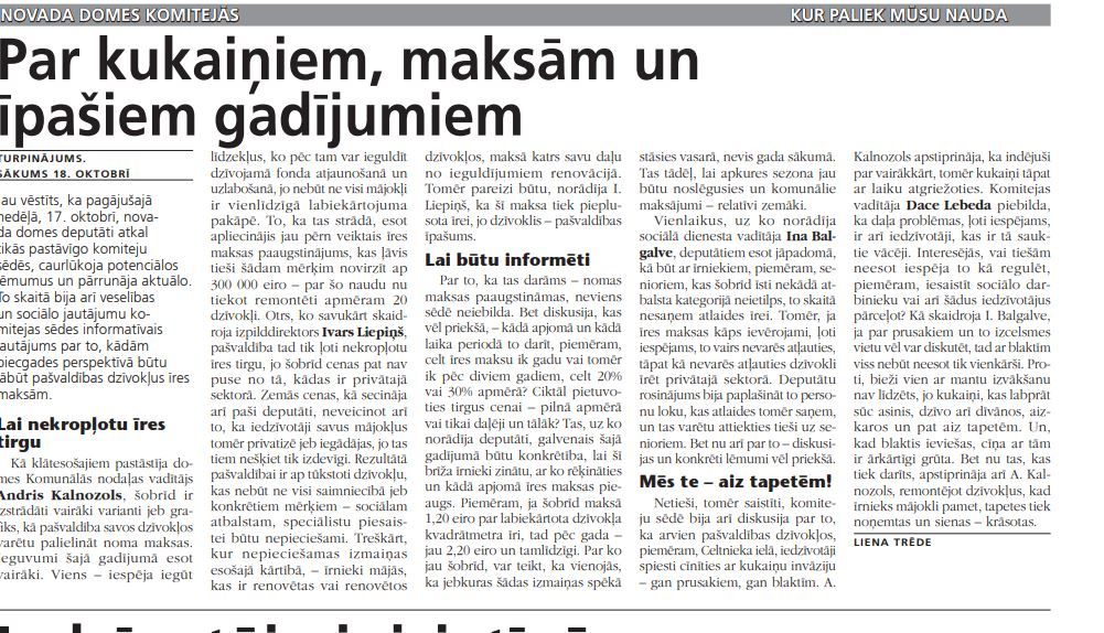 Vakar, 17. oktobrī, novada domes deputāti atkal tikās pastāvīgo komiteju sēdēs. Viņi caurlūkoja jautājumus, kurus virzīt apstiprināšanai domes sēdē, kas plānota jau 31. oktobrī. Taču bija arī virkne informatīvu jautājumu, kas skar mazliet tālāku nākotni. To skaitā veselības un sociālo jautājumu sēdē runātais par to, kādām piecgades perspektīvā būtu jābūt pašvaldības dzīvokļus īres maksām.