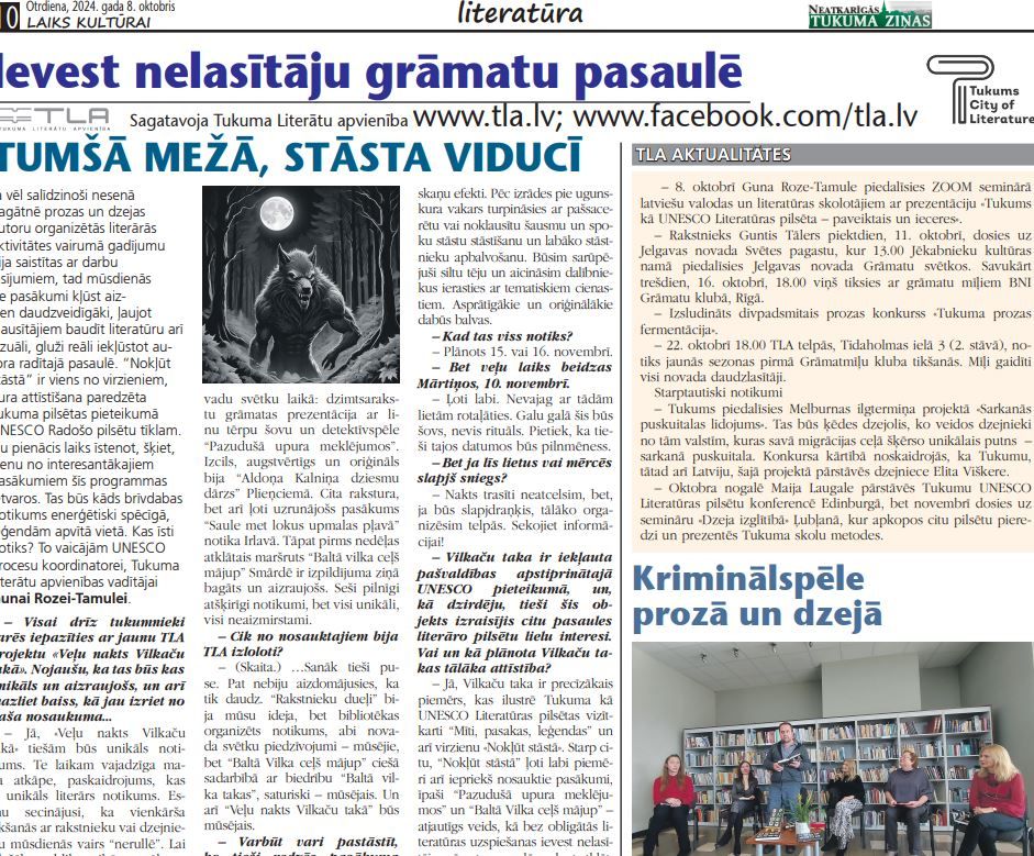Laikā no 21. līdz 25. oktobrim norisinājās UNESCO Literatūras pilsētu tīkla ikgadējā konference. Šogad par tās norises vietu bija izraudzīta pirmā šī tīkla pilsēta Edinburga (Apvienotā Karaliste, Skotija). Un pirmo reizi vēsturē konferencē tika pārstāvēts arī Tukums, kas UNESCO Radošo pilsētu tīklam pievienojās pirms gada, proti, 2023. gada 31. oktobrī. Mūsu pilsētas vārdu pasaulē nesa Tukuma Literātu apvienības valdes locekle Maija Laugale.