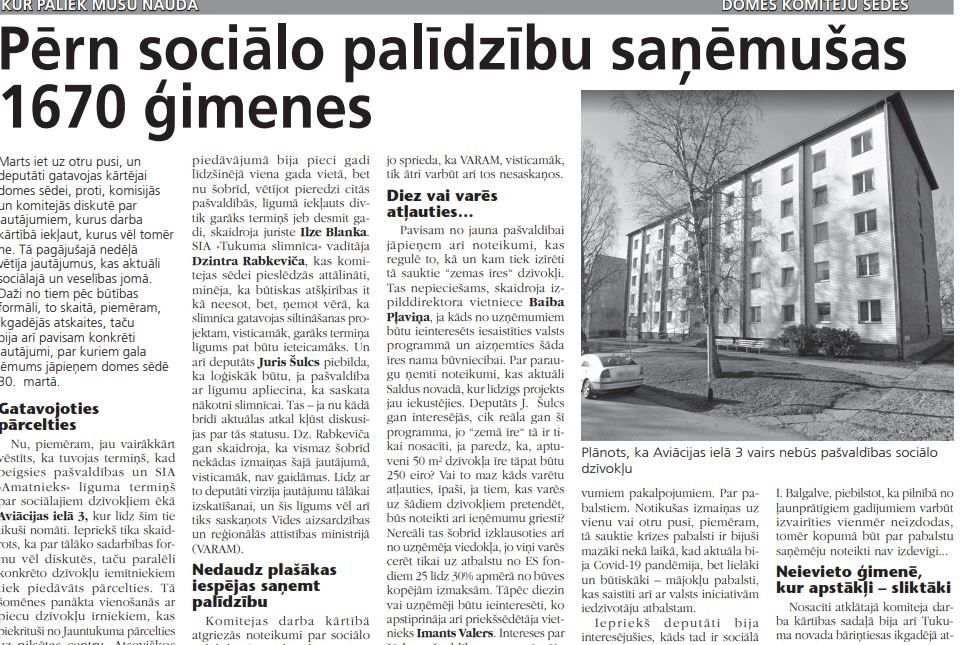 Pagājušajā nedēļā norisinājās novada domes pastāvīgo komiteju sēdes, kurā deputāti sprieda par šobrīd aktuālo. Paralēli darba kārtības jautājumiem, kas jau šajā mēnesī tiks virzīti uz balsošanu domē, daļa – vēl tikai informatīvi. Piemērām, jau minējām (13. janvāra laikrakstā), ka kultūras, sporta un izglītības jautājumu komitejā klātesošie tika iepazīstināti ar aktuālo situāciju novada skolu tīklā. Savukārt sociālo jautājumu komitejā nācās runāt par pašvaldības dzīvokļiem un arī iestādēm.