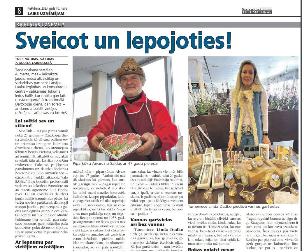 Tādā noskaņā sestdien, 4. martā, mēs – laikraksta ļaudis, mūsu atbalstītāji un sadarbības partneris «Latvijas lauku izglītības un konsultāciju centrs» – satikāmies Tukuma ledus hallē, kur notika gan laikraksta organizētā tradicionālā Dārzkopju diena, gan šoreiz – ar domu atbalstīt vietējos ražotājus – arī pavasara tirdziņš.