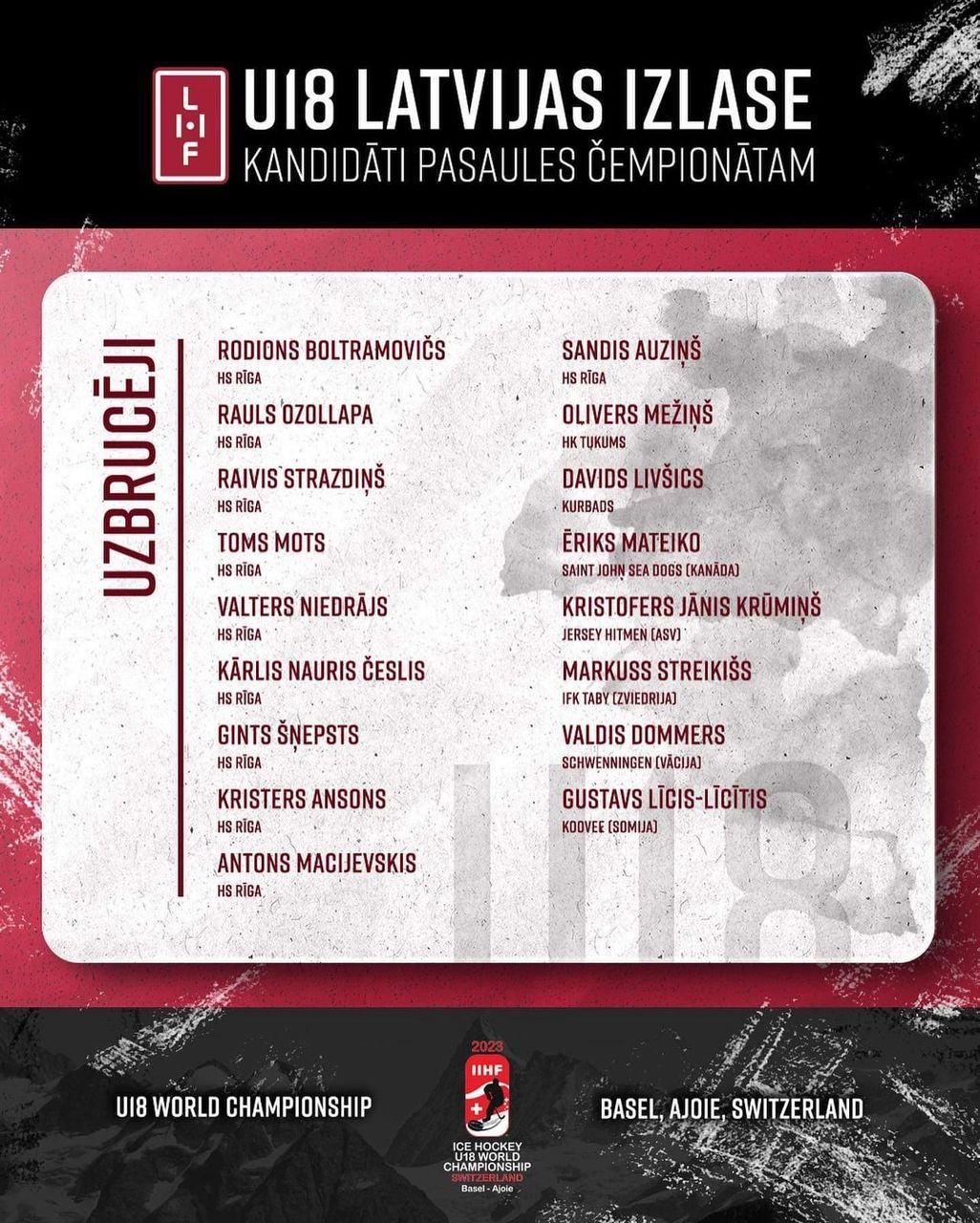 Latvijas U-18 izlases galvenais treneris Oļegs Sorokins ceturtdien, 13. aprīlī, nosauca valstsvienības sastāvu Pasaules čempionātam elites divīzijā, kas no 20. līdz 30. aprīlim norisināsies Šveices pilsētās Bāzele un Porantruī.