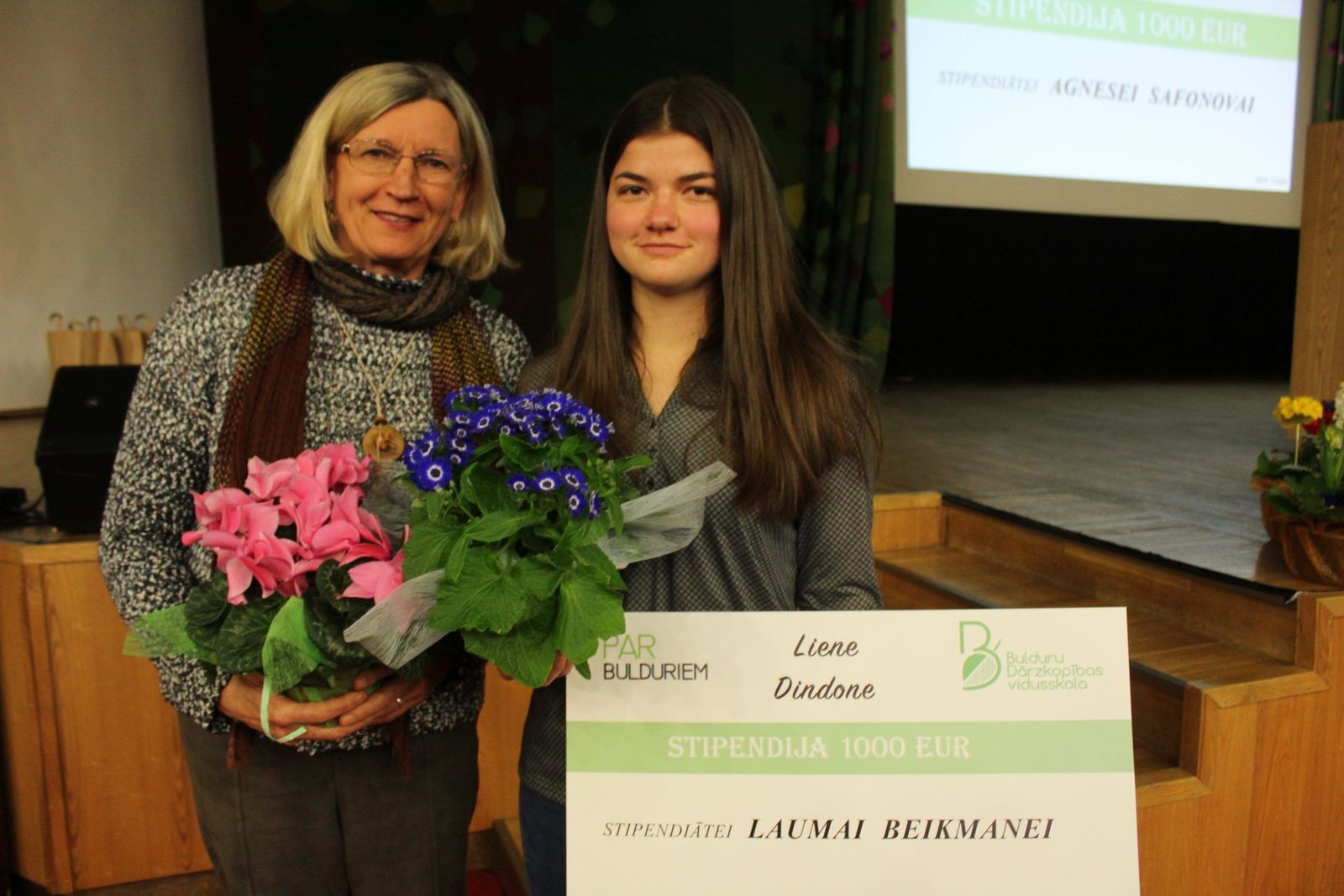 Un pirmo stipendiju 1000 eiro apmērā saņēma mūsu novadniece Lauma Beikmane. Lauma mācas trešajā kursā un apgūst dārzkopības tehniķa profesiju. Viņai ļoti patīk puķkopība, ekonomika, augu aizsardzība. Jauniete dzīvo Tumes pagastā. Pasniedzot stipendiju, Liene Dindone teica: ”Esmu sajūsmā, ja redzu, ka vēl arvien Bulduru dārzkopības skola pastāv un cerams turpinās augt un veidoties. Es šobrīd visus gribu aicināt domāt par mūsu jauniešiem, jo jaunieši ir mūsu nākotne. Jūs visi to zināt, bet vai jūs arī kaut ko darāt, lai atbalstītu mūsu jauniešus?”