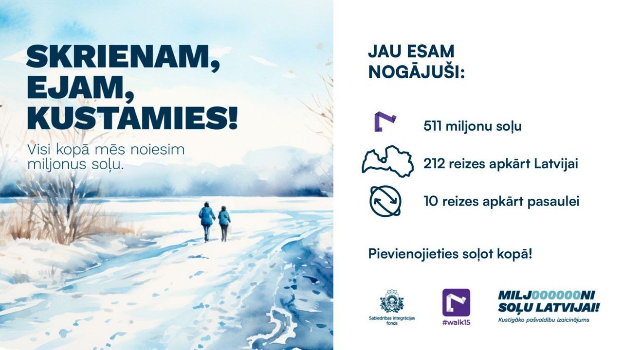 Sabiedrības integrācijas fonda rīkotais staigāšanas izaicinājums “Miljoni soļu Latvijai”, kurā aicinātas iesaistīties Latvijas pašvaldības un to iedzīvotāji, norisinās jau teju divas nedēļas. Līdz izaicinājuma noslēgumam palicis pusotrs mēnesis, tāpēc pienācis laiks aplūkot līdzšinējo progresu ‒ cik aktīvi ir Latvijas iedzīvotāji un kurās pašvaldībās ir vislielākais noieto soļu skaits.