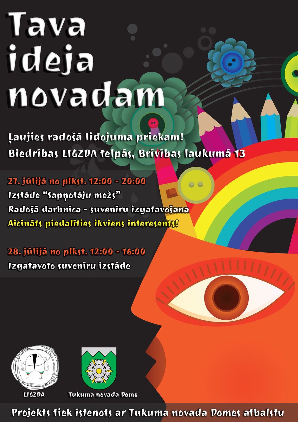 Biedrība «Ligzda» aicina visus 27. jūlijā no 12.00 līdz 20. 00 veidot suvenīrus «Tava ideja novadam» un 28. jūlijā no 12.00 līdz 16.00 apskatīt izgatavotos suvenīrus un izstādi «Sapņotāju mežs».Gaidīsim visus interesentus biedrībā ligzda Brīvības laukumā 13, otrajā stāvā!Biedrība «Ligzda»