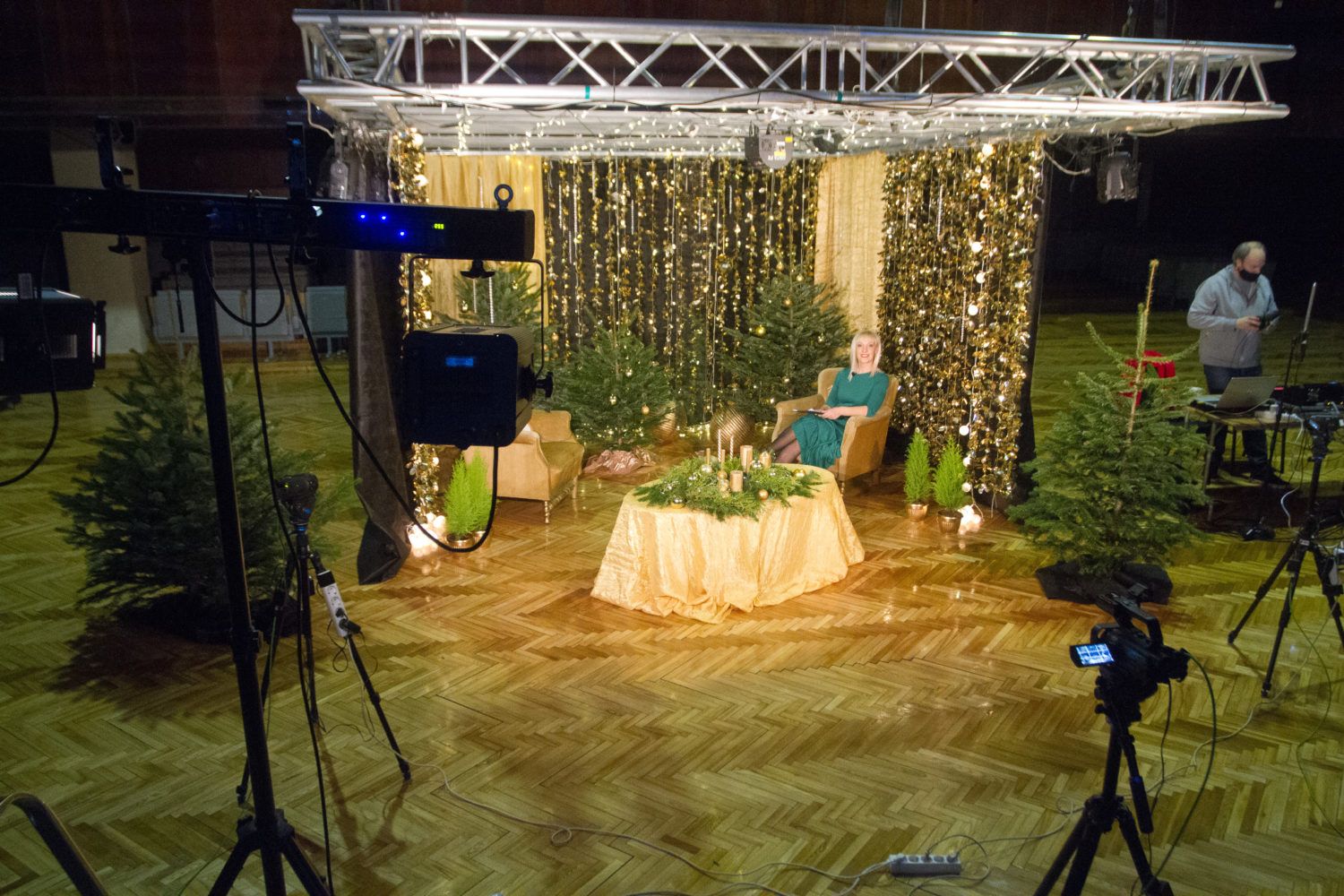 Tukuma kultūras nama lielā zāle pirmssvētku laikā ir pārvērsta stilizētā studijā, kur, zeltītiem rotājumiem mirgojot, tiek ierakstīts Vecgada raidījums – veltījums Tukuma novada iedzīvotājiem, kas būs skatāms sociālajos tīklos.