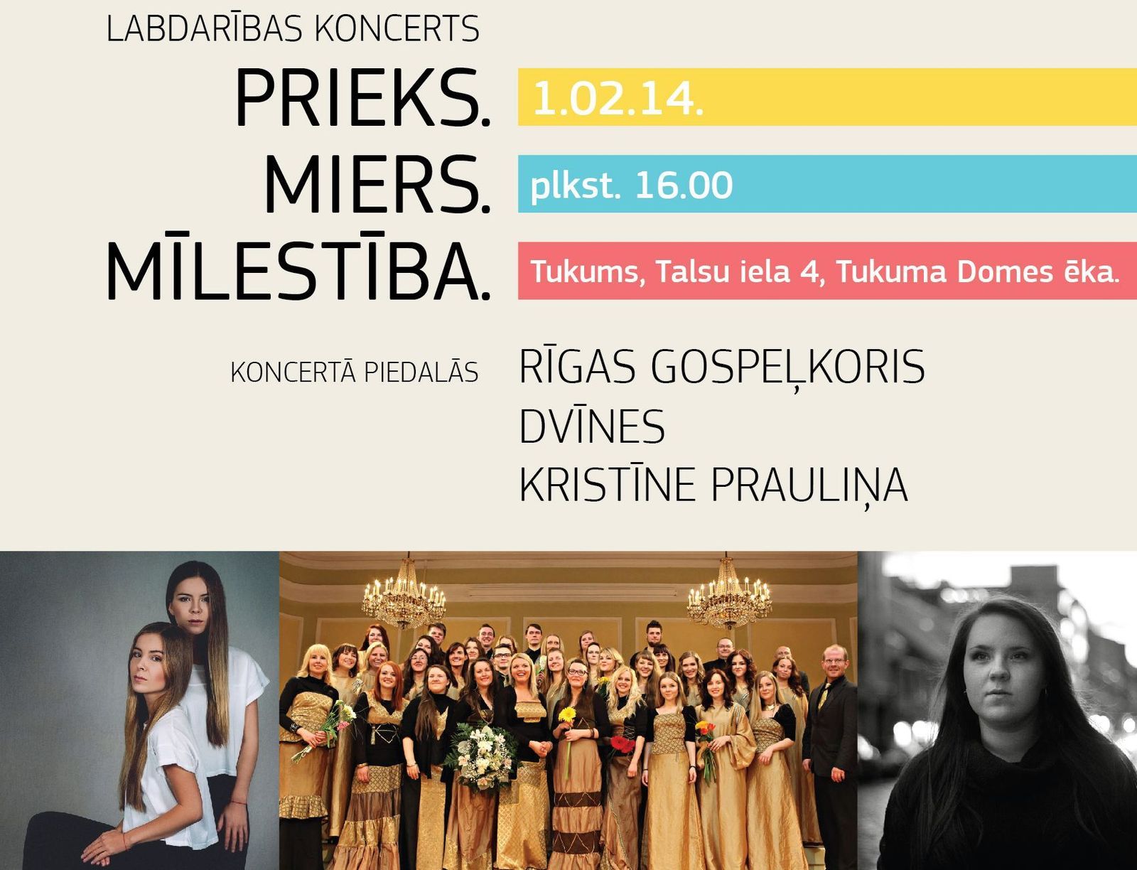 1. februārī 16.00 Tukuma domes ēkā, Talsu ielā 4, LMMA aicina uz sirsnīgu labdarības koncertu «Prieks. Miers. Mīlestība». “Tā kā pats esmu no Tukuma, nereti esmu domājis par iespēju palīdzēt Tukuma rajona grūtībās nonākušajām ģimenēm. Būdams mūziķis, izvērtēju iespēju kopā ar saviem draugiem un domubiedriem noorganizēt labdarības koncertu. Mūsu mērķis ir atbalstīt daudzbērnu ģimenes un ģimenes, kuras nonākušas grūtībās. Ienākumi no koncertā saziedotajiem līdzekļiem tiks nodoti labdarības organizācijai “Haleva dienests” kura savukārt tos izmantos mūsu noteiktajam mērķim,” tā koncerta iniciators, viens no LMMA dibinātājiem – Andris Ivančiks.