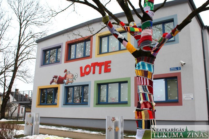 Koks ietērpts šallē, kas saulē greznojas visās varavīksnes krāsās – šādu skatu var redzēt ikviens bērnudārza «Lote» apmeklētājs, un arī garāmgājēji var priecāties par šo unikālo darbu.