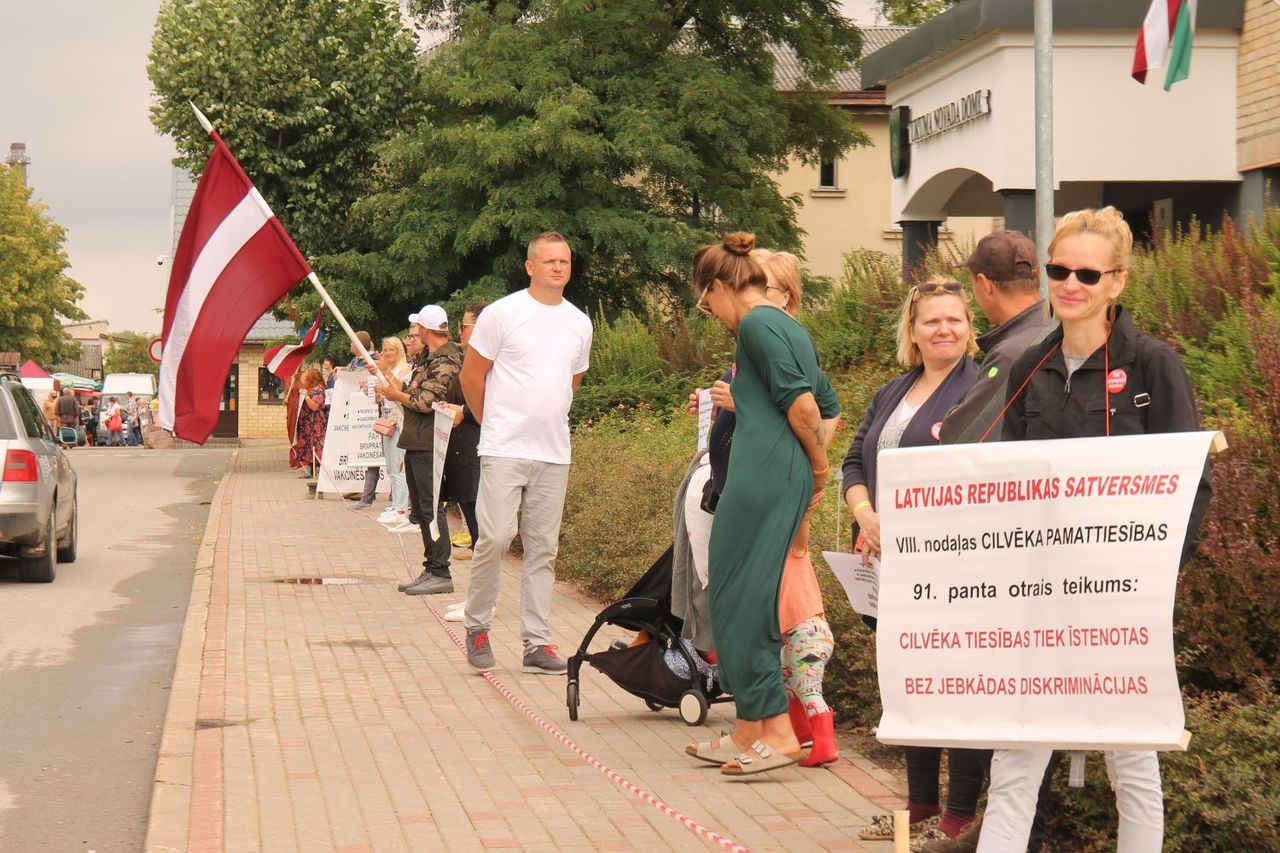 Šodien, 14. augustā, pie Tukuma novada domes norisinās protesta akcija, kuras dalībnieki galvenokārt iebilst pret noteikumiem par covid-19 vakcināciju. Kā novērojām, pati akcija noris pavisam miermīlīgi – cilvēki ar plakātiem rokās distancēti stāv aiz norobežojošās lentas pie domes ēkas. Tomēr apkārt bija izveidojies paliels vērotāju pūlis – vismaz pārsimts cilvēku, kas nekādu savstarpējo distanci neievēro. Citi filmēja notiekošu, citi – savstarpēji apspriedās vai applaudēja, ja kāds auto pabrauca garām signalizējot. Akcija oficiāli noslēgusies pulksten 13.00.