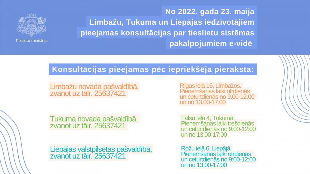 Lai veicinātu tieslietu sistēmas pakalpojumu pieejamību, no pirmdienas, 23. maija, Limbažu, Tukuma un Liepājas iedzīvotājiem tiks sniegtas klātienes konsultācijas par iespējām tos izmantot attālināti elektroniskajā vidē. Tieslietu ministrija sadarbībā ar Valsts zemes dienestu, Uzņēmumu reģistru, Juridiskās palīdzības administrāciju, Patentu valdi un Valsts valodas centru īsteno pilotprojektu “Tieslietu sistēmas pakalpojumi pašvaldībās” ar mērķi uzlabot iedzīvotāju digitālās prasmes patstāvīgi izmantot tieslietu sistēmas iestāžu sniegtos e-pakalpojumus.