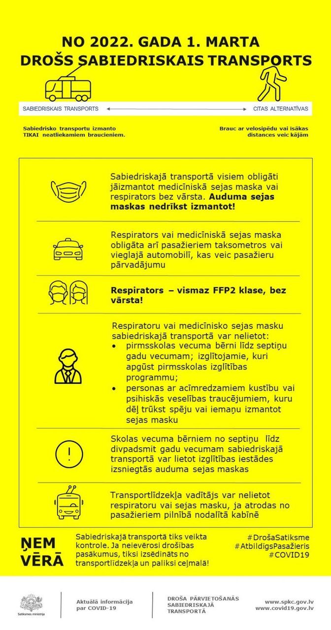 Valdība šodien, 10. maijā, lēma, ka no 15. maija sabiedriskajā transportā medicīniskās sejas maskas un respiratori vairs nebūs obligāta prasība.